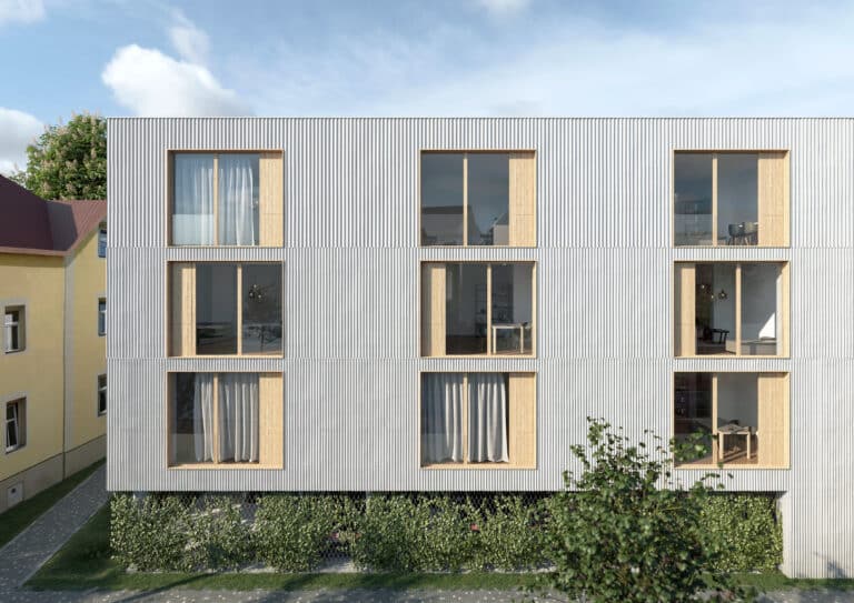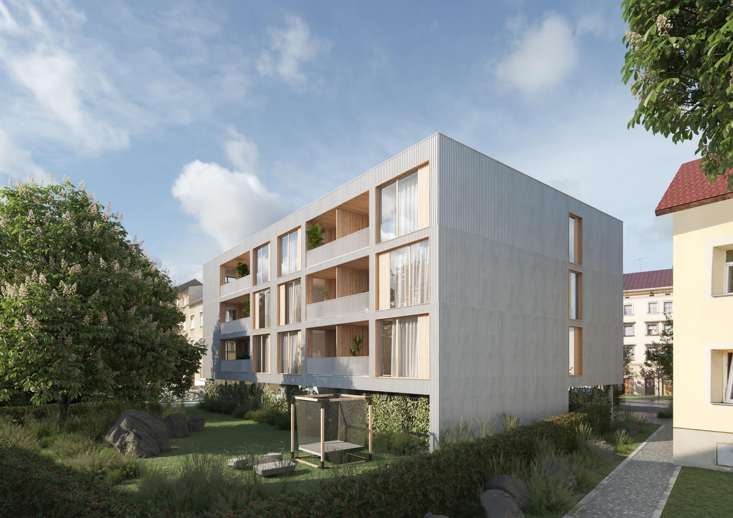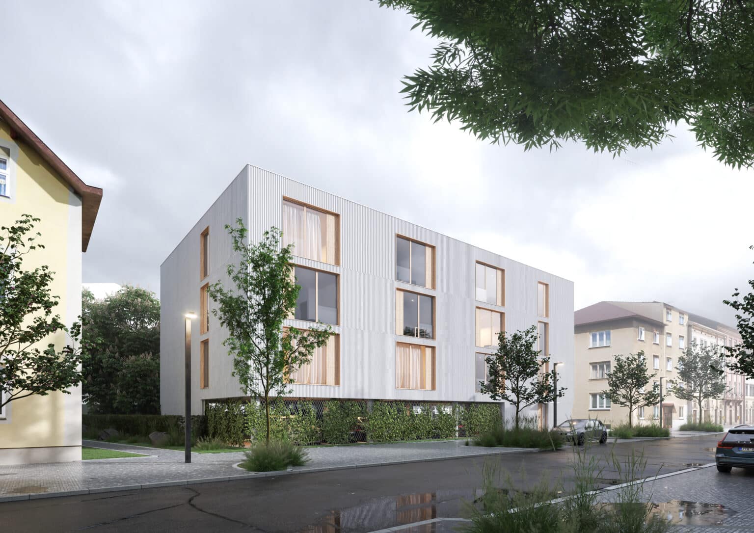 Bytový dům citlivě doplňuje uliční frontu Husovy ulice a respektuje charakter lokality. Seříznutý roh v parteru vytváří dynamický akcent a praktický prvek pro vizuální bezpečnost, fasáda graduje strukturou a rytmem po patrech a otevření směrem do zahrady vytváří harmonické propojení s vnitroblokem. Objekt tak nabízí moderní, komfortní a kvalitní městské bydlení, které se přirozeně začleňuje do prostředí Mariánských Lázní.
