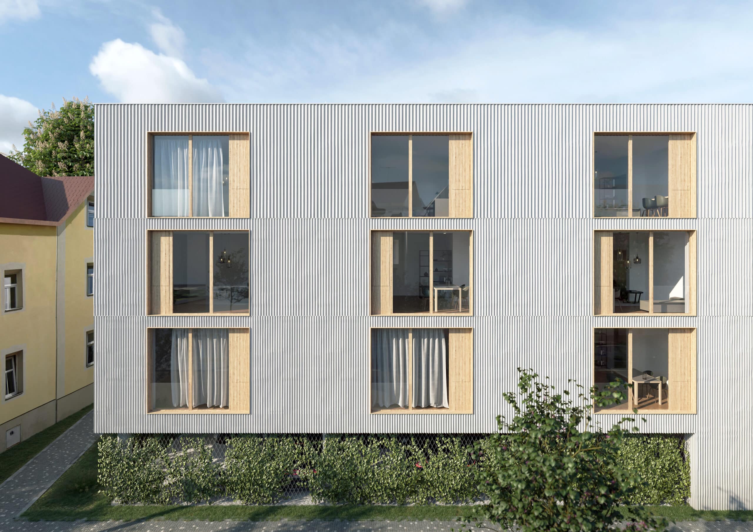 Směrem k ulici fasáda ctí tradiční proporce a rytmus, směrem do zahradní části se objekt otevírá lodžiemi, čímž propojuje interiéry bytů se zeleným vnitroblokem. Povrch fasády je strukturovaná omítka s jemným členěním, která graduje po patrech v síle vzoru, dodává fasádě hloubku a subtilní rytmus. Popínavá vegetace v parteru odlehčuje uliční fasádu a zjemňuje kontakt s městským prostorem.