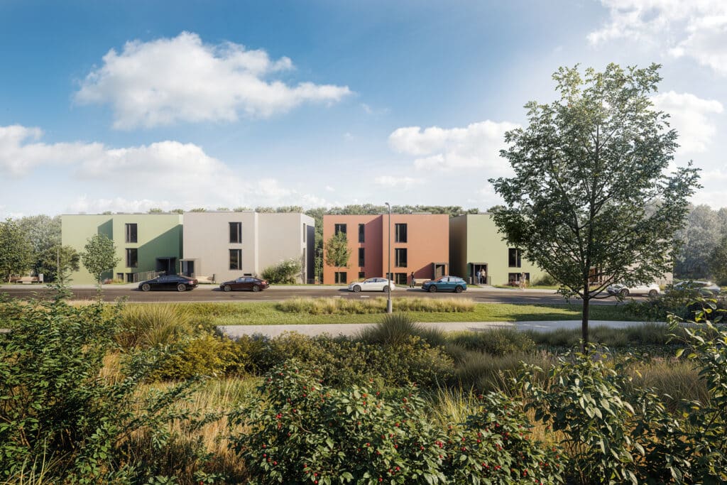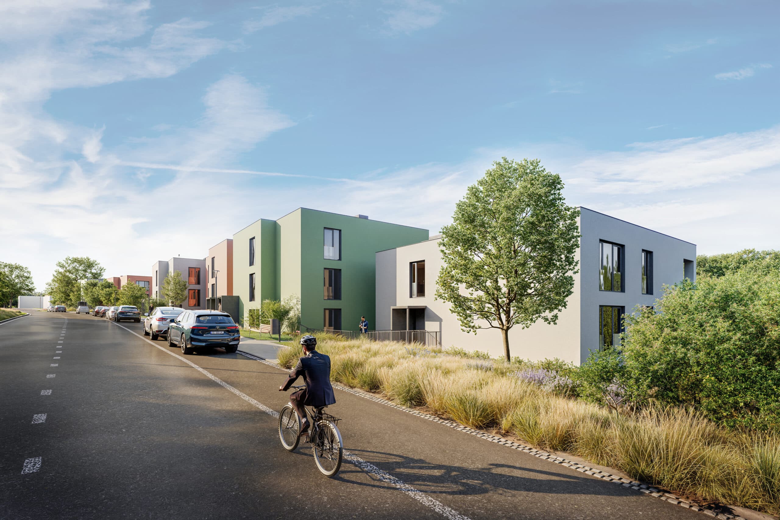 Barevné řešení staví na pastelové paletě přírodních odstínů – světle šedé, cihlově pastelové a tlumeně šedozelené. Kombinace těchto tónů podtrhuje klidnou a soudobou atmosféru a harmonicky propojuje zástavbu s okolní krajinou.
