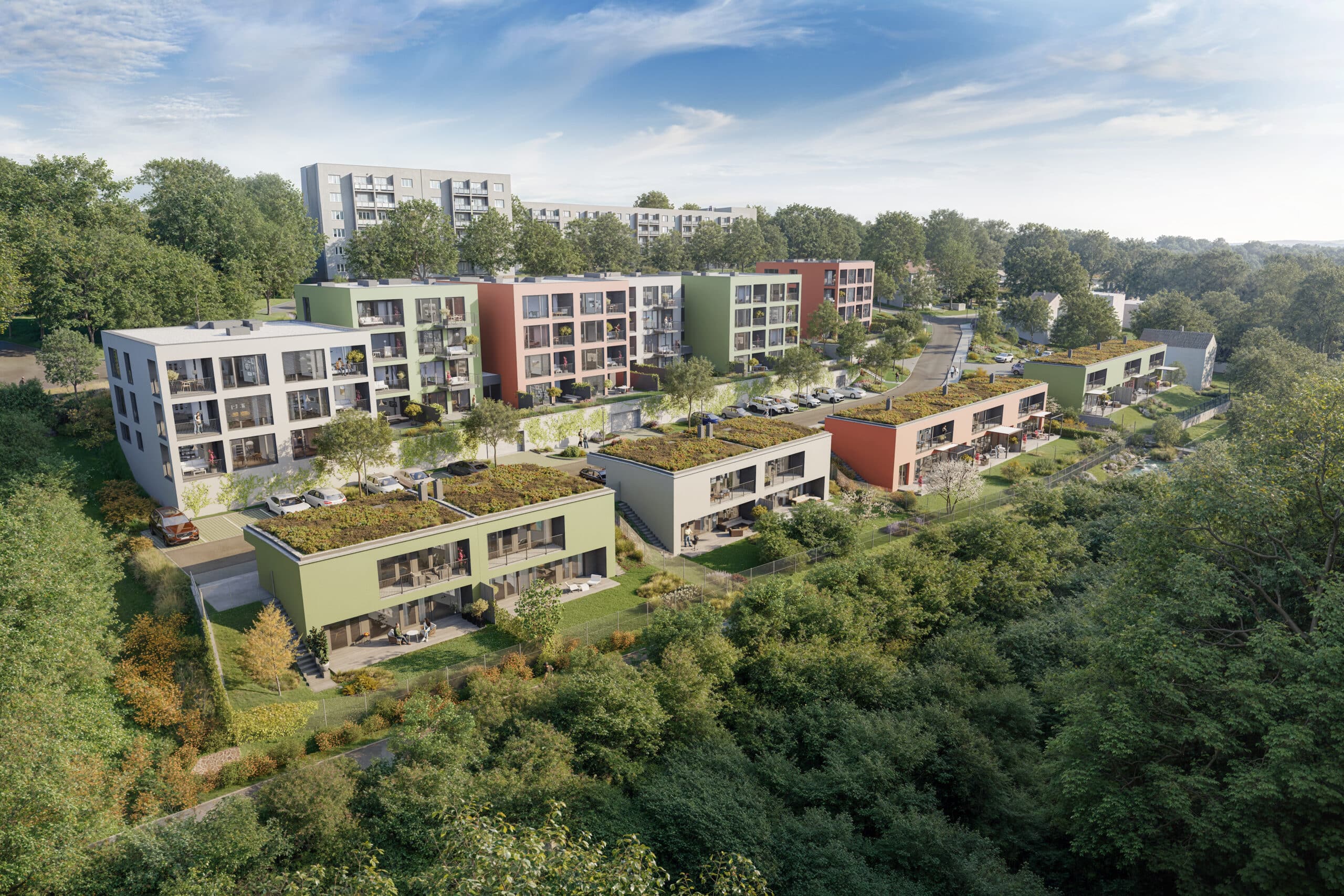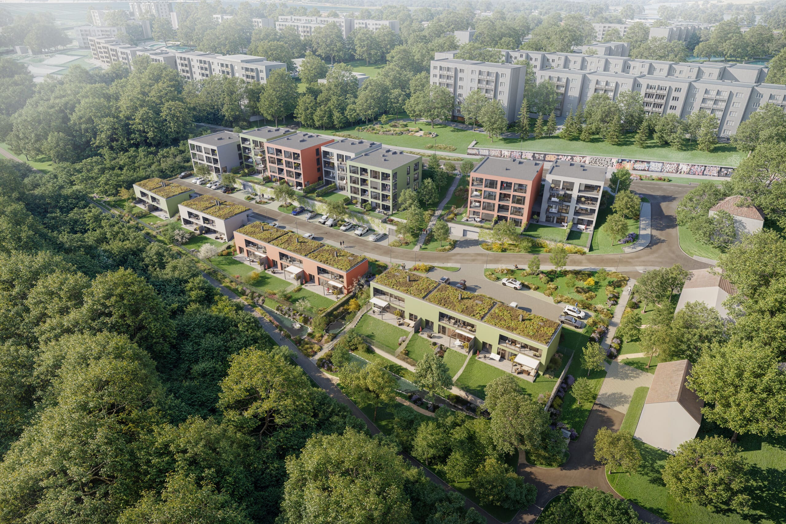 Architektura pracuje s jasně artikulovanými hmotami, jejichž rytmizace a horizontální členění dávají zástavbě měřítko a soudržnost. Obytné kubusy na severní podnoži vytvářejí živou uliční frontu, zatímco jejich jižní fasády se otevírají do krajiny velkoformátovým prosklením, lodžiemi a střešními terasami. Rodinné domy pod nimi zajišťují plynulý přechod mezi měřítkem bytových domů a zahradami směřujícími k parku.