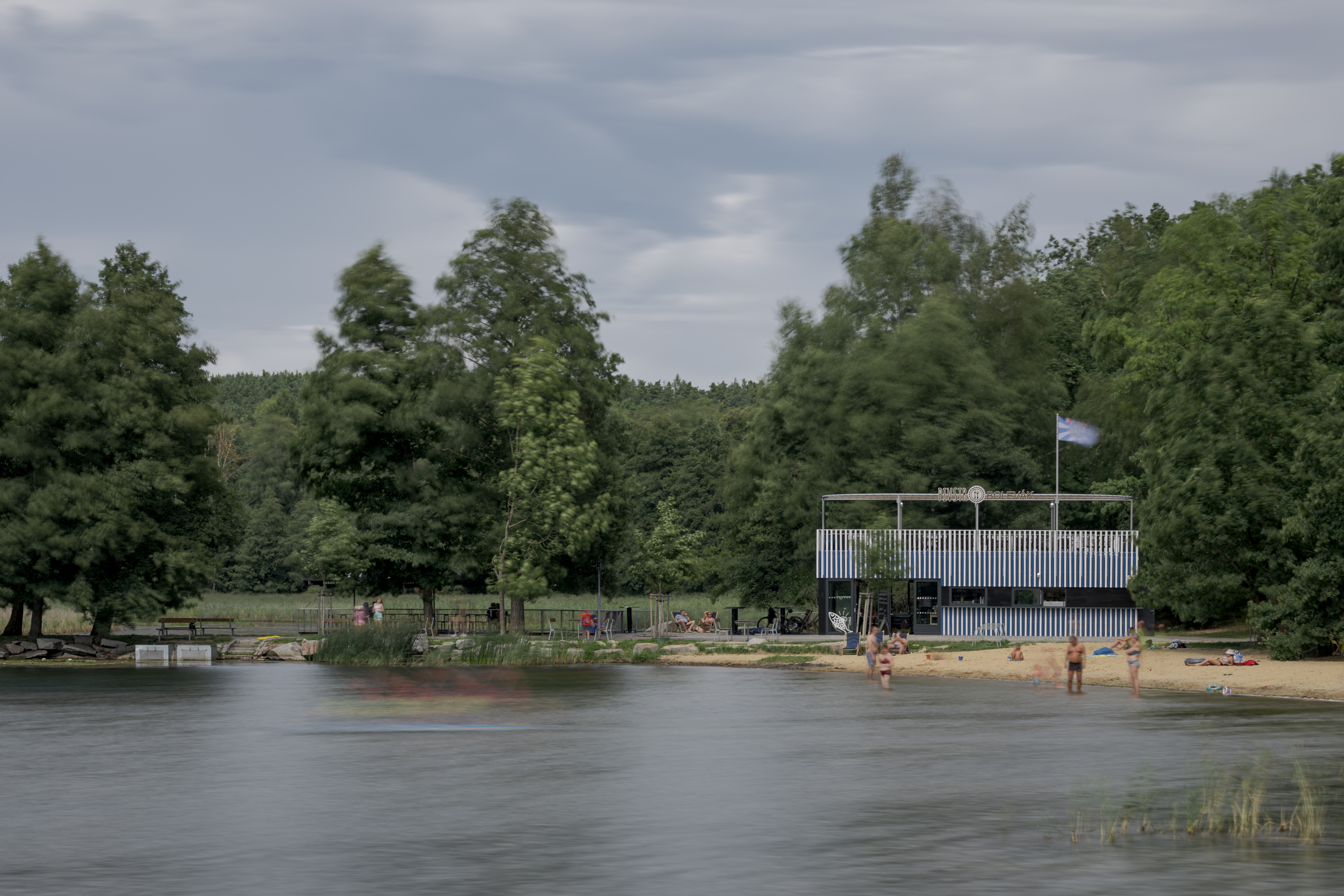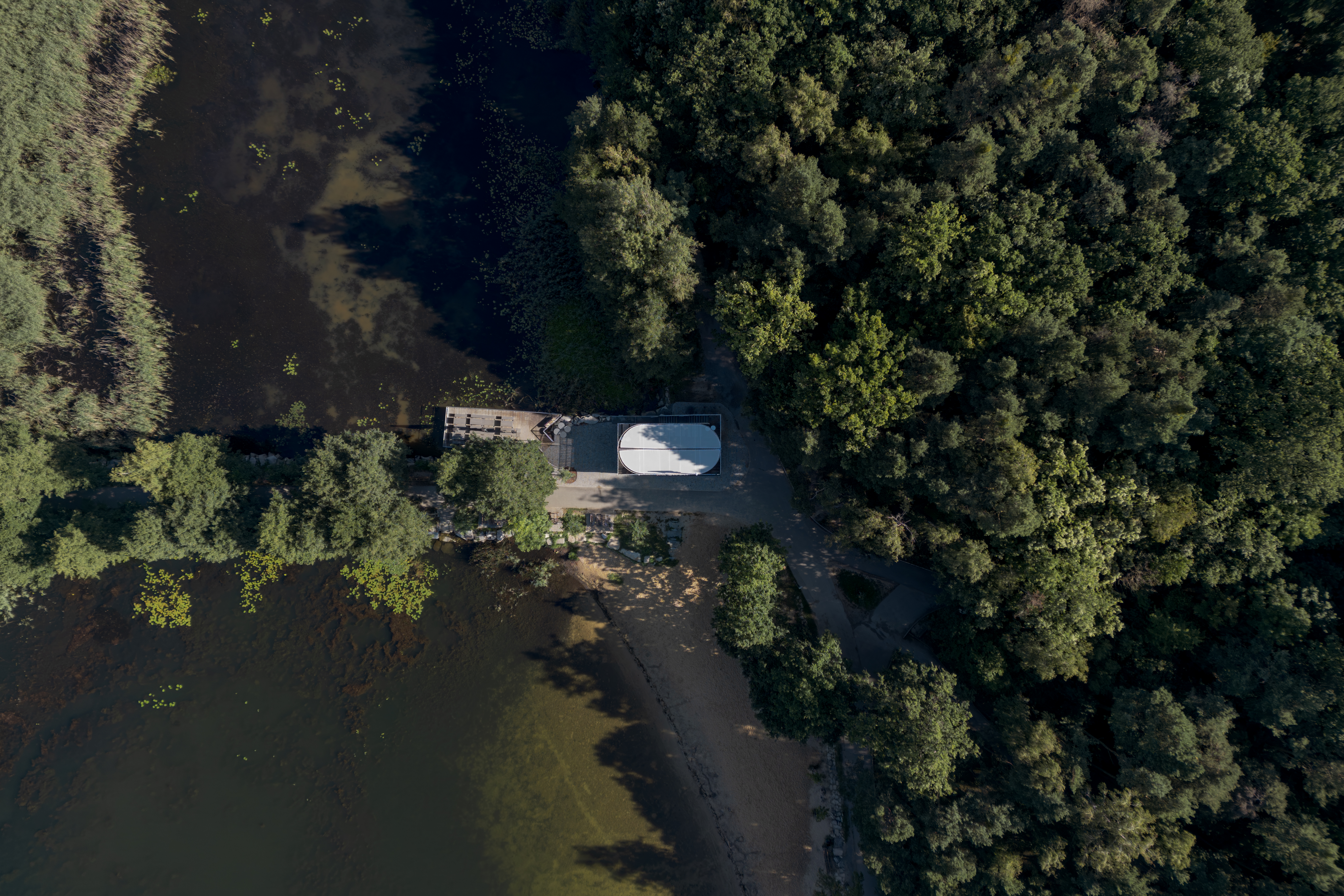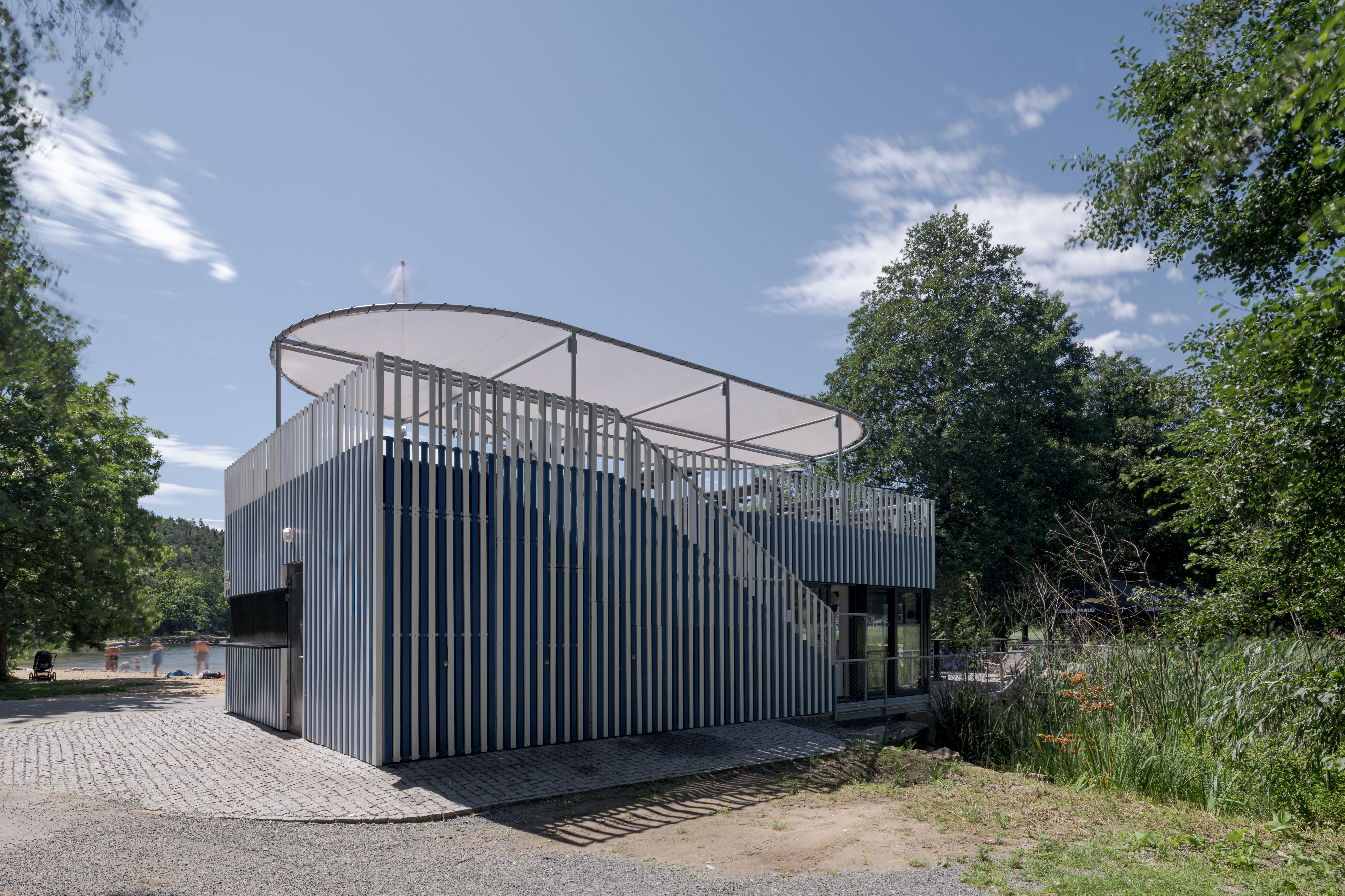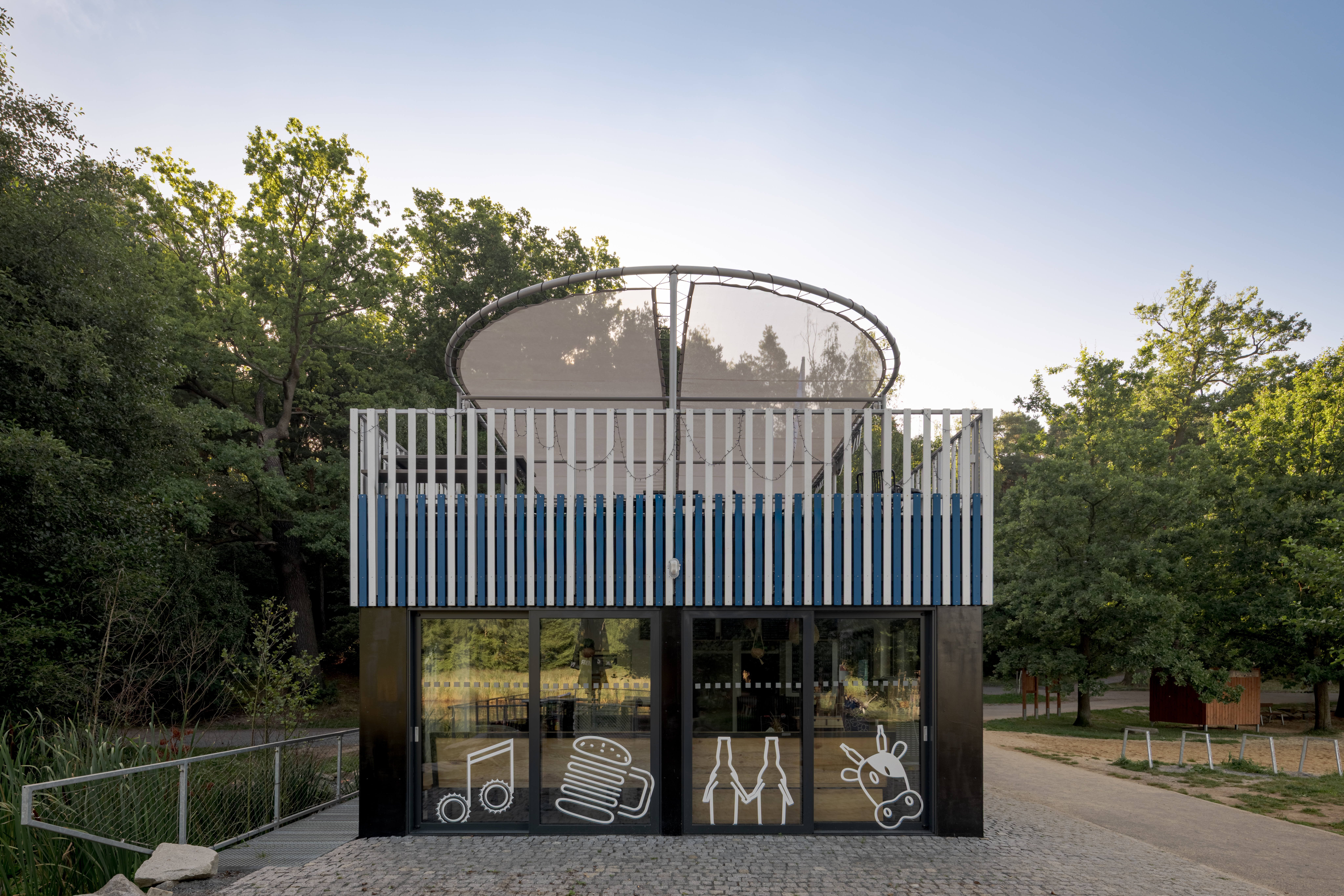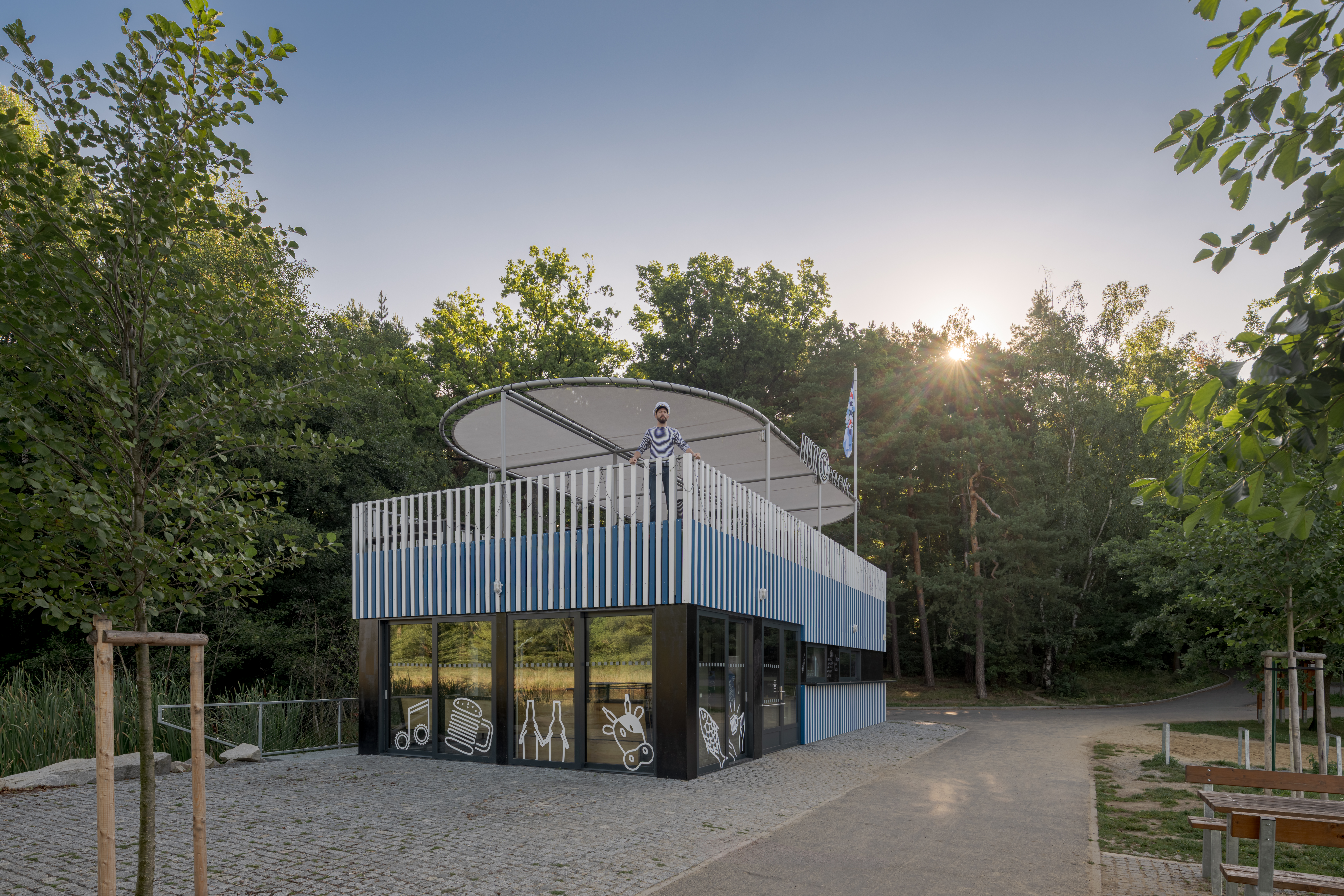 Celý objekt kombinuje modulární industriální charakter recyklovaných kontejnerů s lehkostí a hrou forem horního patra, čímž vzniká unikátní vizuální identita a jasná tematická návaznost na vodní prostředí.
