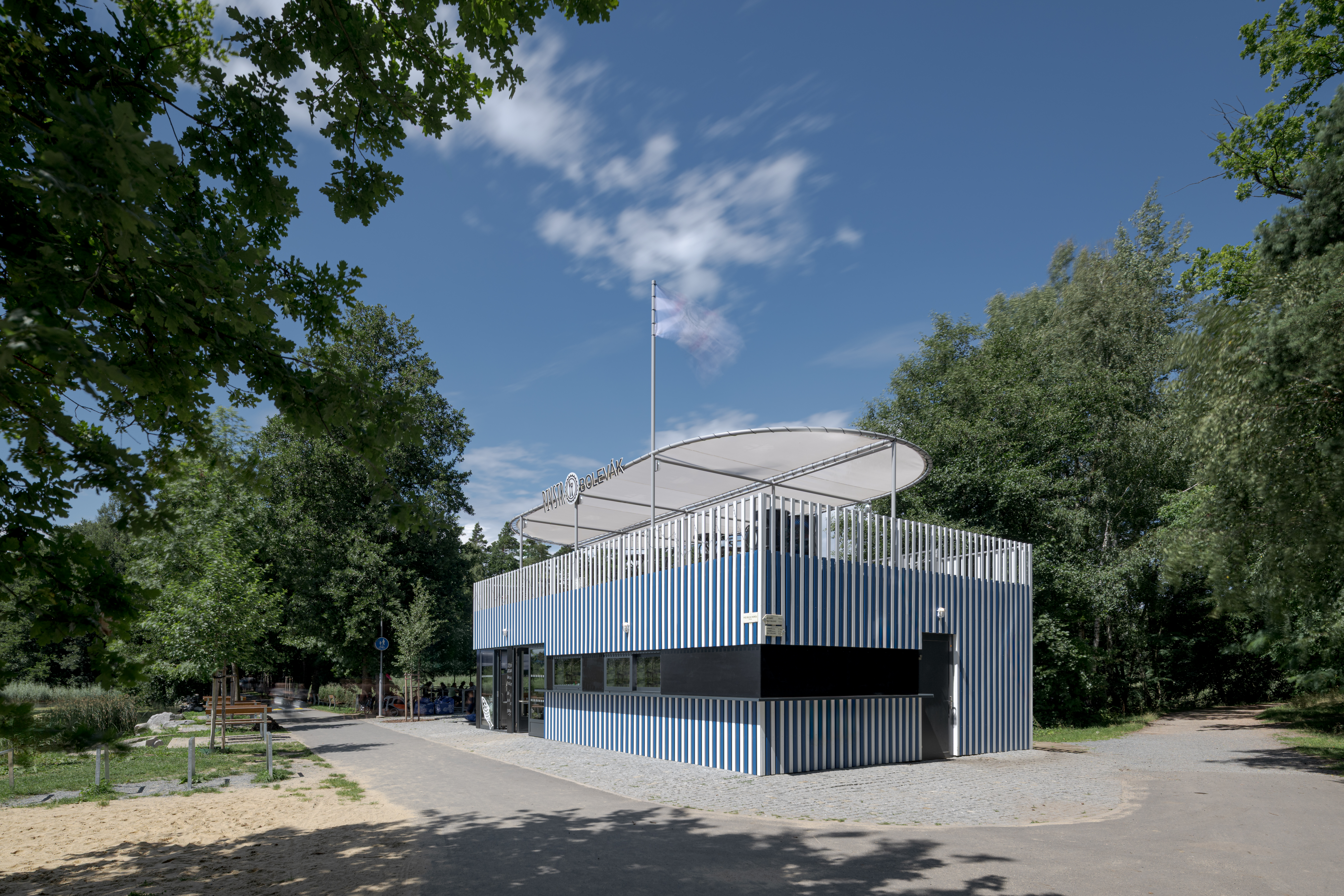 Spodní patro tvoří recyklované lodní kontejnery, které vytvářejí kompaktní a funkční celek pro celoroční bistro s kuchyní a hygienickým zázemím. Fasáda je členěna svislými dřevěnými latěmi v modro-bílé kombinaci, inspirované námořnickým trikem, který podtrhuje propojení s lodní tradicí.